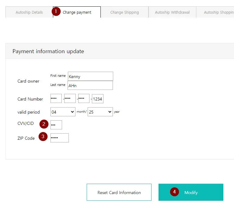 → Payment Information Update → Enter CVV→ Enter ZIP Code → Save by clicking Modify