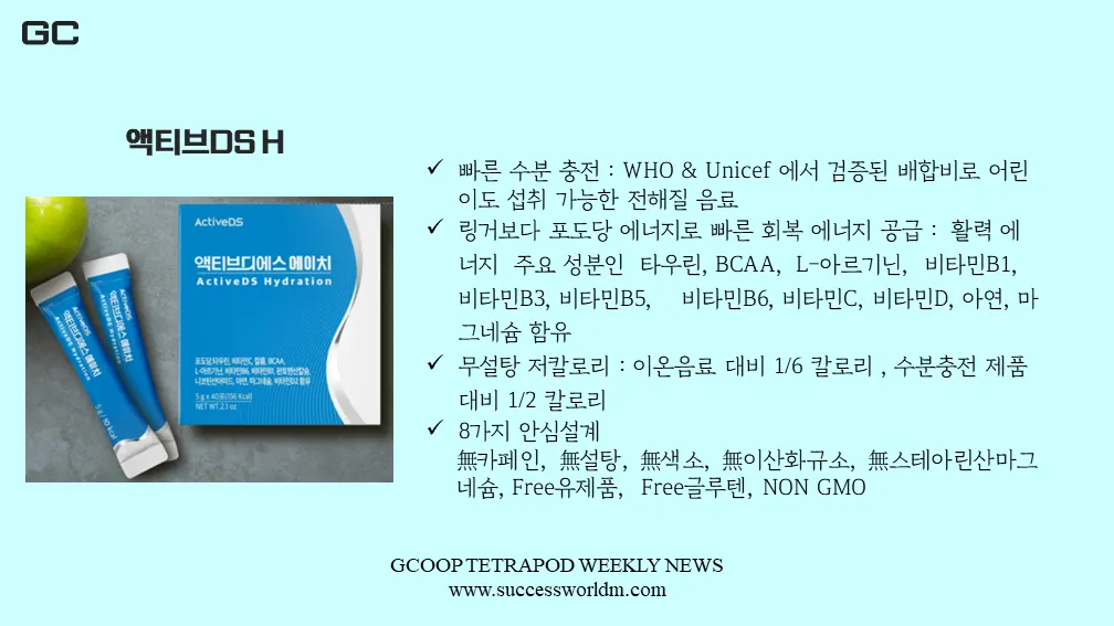 ์กํฐ๋ธ ๋์์ค H๋ ์ฐ๋ฆฌ๊ฐ ์ผ๋ฐ์ ์ผ๋ก ์๊ณ ์๋ ํฌ์นด๋ฆฌ์ค์จํธ ๋ฑ๊ณผ ๊ฐ์ ์ ํด์ง ์๋ฃ๋ก, ๋ชธ์ ๋น ๋ฅด๊ฒ ํก์๋๋ฏ๋ก, ์ฌ๋ฆ์ด๋ ๋์ ๋ง์ด ํ๋ฆฌ๋ ๋ถ๋ค์ด ์ ์ฉํฉ๋๋ค. ๋์ ํ๋ฆด ๋ ๋ณดํต ๋ฌผ๋ง ํ๋ฆฐ๋ค๊ณ ์๊ฐํ๋, ๋ํธ๋ฅจ๊ณผ ์นผ๋ฅ ๋ฑ๋ ํฌํจ๋์ด ์์ต๋๋ค. ๋ํ ํฌ๋๋น์ด ํฌํจ๋์ด ์์ด, ํ๋ค ๋ ํฌ๋๋น ๋ง๊ฑฐ๋ฅผ ๋ง์ ํ์ ์์ด, ์ด ํํฌ๋ง์ผ๋ก ์ฌ๋ฌ๋ถ์๊ฒ ํ๋ณต ์๋์ง๋ฅผ ๊ณต๊ธํ๋ค. ์ ํฌ ์กํฐ๋ธ ๋์์ค H๋ WHO๋ฟ ์๋๋ผ ์ ๋์ธํ์์ ๊ฒ์ฆ๋ ๋ฐฐํฉ๋น๋ฅผ ์ฌ์ฉํ์ฌ, ์ด๋ฆฐ์ด๋ค๋ ์ญ์ทจ ๊ฐ๋ฅํ๋ฉฐ, ์ผ๋ฐ ์ด์จ ์๋ฃ ๋๋น ๋ฌด์คํ ์ ์นผ๋ก๋ฆฌ๋ก ๊ตฌ์ฑ๋์ด ์์ต๋๋ค. ๋ํ ์ธ์ฒด์ ์ ํดํ ์ฑ๋ถ ์์ด ์๋ถ์ ๊ณต๊ธํด์ค๋๋ค.