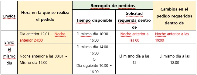 Las solicitudes de recogida de pedidos el mismo día deben hacerse antes de las 12 p.m. y se pueden recoger entre las 2 p.m. y las 4 p.m.