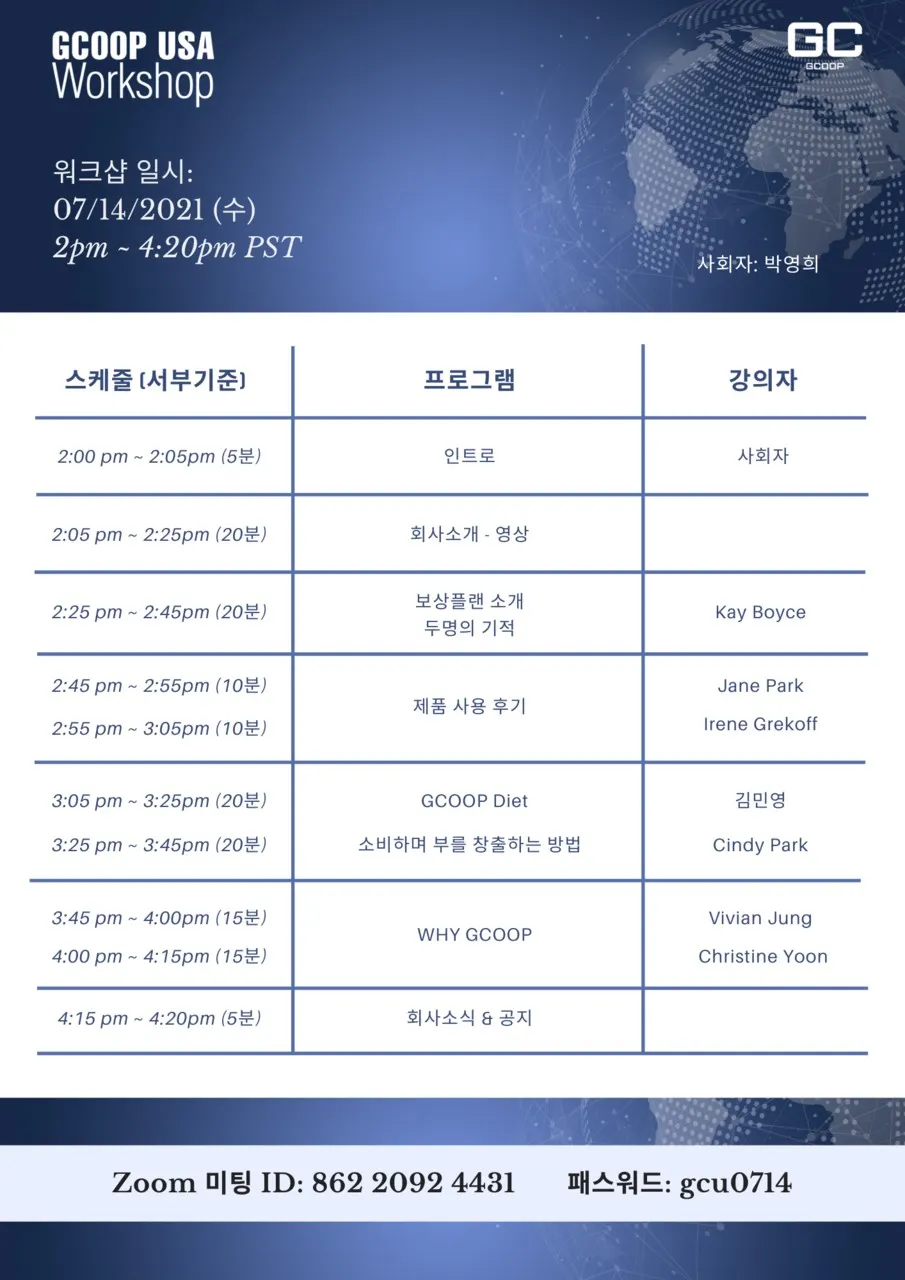 ์ง์ฟฑ USA(๋ฏธ๊ตญ) ์๋ฐ์ด ์ธ๋ฏธ๋์ธ 'GCOOP USA Workshop'์ด ๋ฏธ์๋ถ์๊ฐ 7์ 14์ผ(์) 2์, ๋ฏธ๋๋ถ์๊ฐ 5์, ํ๊ตญ์๊ฐ 7์ 15์ผ(๋ชฉ) ์ค์ 6์์ ์์์ต๋๋ค. ์ด๋ฒ ์ค ์ธ๋ฏธ๋๋ ํ๊ตญ์ด๋ก๋ง ์งํ๋์์ต๋๋ค.