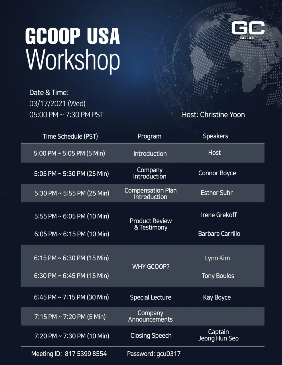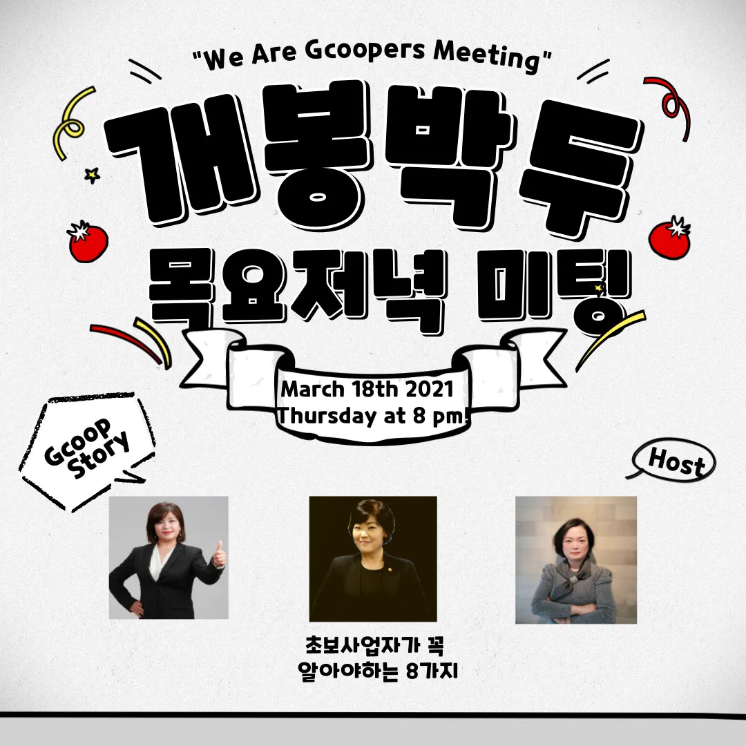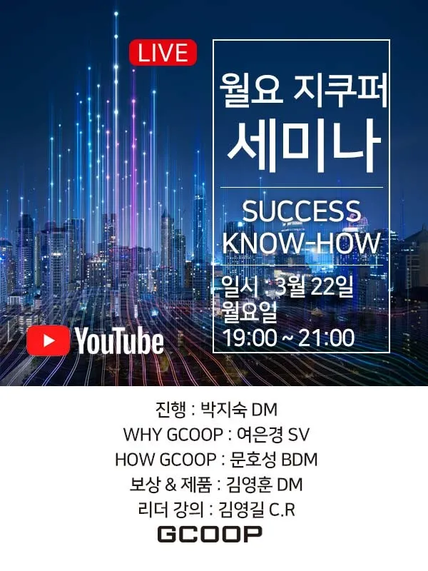 ์ง์ฟฑ USA ๋ฉ๋ฆด๋๋์์๋ 'We are GCoopers' ๋ชฉ์ ์ค ์ธ๋ฏธ๋๊ฐ ์งํ๋ฉ๋๋ค. ๋ฏธ ๋๋ถ์๊ฐ ๊ธฐ์ค์ผ๋ก 3์ 18์ผ ์คํ 8์์ด๋ฉฐ, Host์ Samantha yun, GCOOP Story์ Gloria Choi, ์ด๋ณด์ฌ์