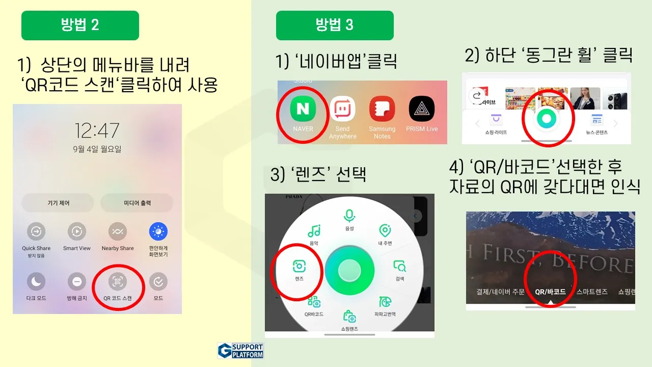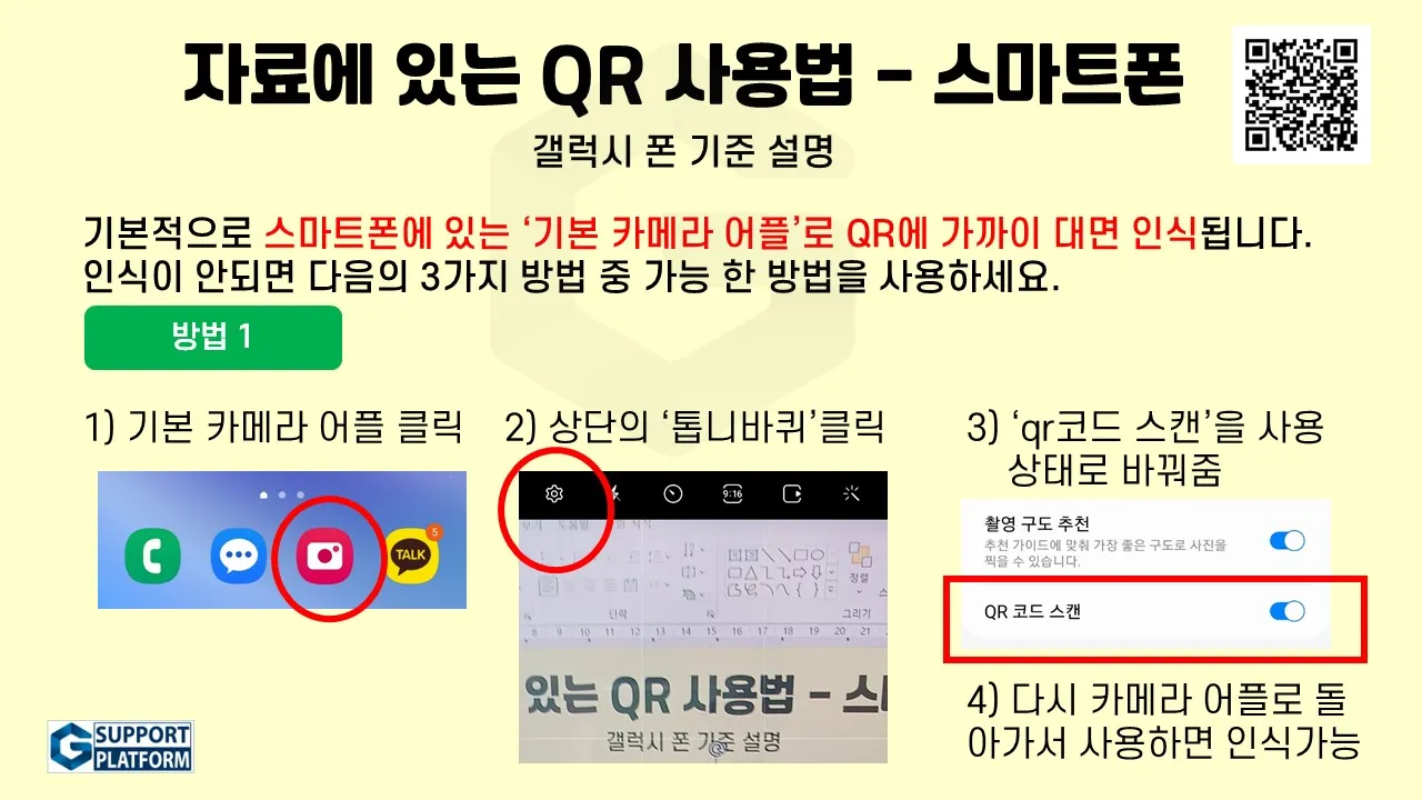 기본적으로 아이폰과 갤럭시 폰 모두 '기본 카메라 어플'을 사용하면 손쉽게 인식가능한데요. 갤럭시 폰의 경우는 기종, 버전 등에 따라 메뉴를 활성화 시켜야 가능하거나 안되기도 합니다. 폰으로 사용방법을 모르는 분들은 다음 3가지 방법 중 하나를 선택해서 사용해보세요.