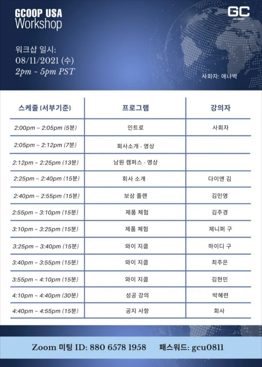 ์์์ผ : 10AM - ๋ณธ์ฌ ์ ํ ์ค ์ธ๋ฏธ๋, 7PM ์์ ์ง์ฟ ํผ ์ธ๋ฏธ๋, 10:30AM USA Tea Time Meeting
