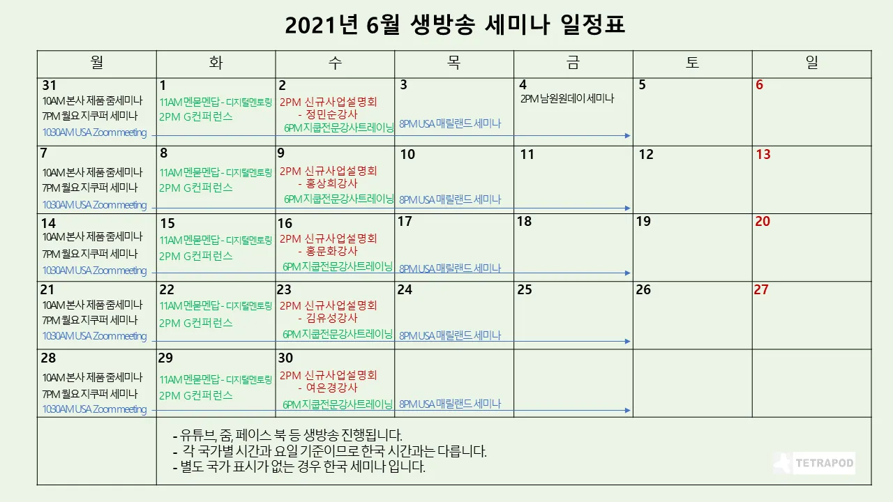 ์์์ผ : 10AM - ๋ณธ์ฌ ์ ํ ์ค ์ธ๋ฏธ๋, 7PM ์์ ์ง์ฟ ํผ ์ธ๋ฏธ๋, 10:30AM USA Tea Time Meeting